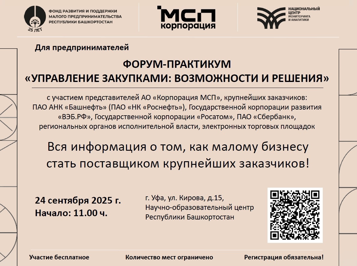 В Уфе 24 сентября пройдет Форум-практикум «Управление закупками: возможности и решения». Как сообщает пресс-служба Корпорации малого и среднего предпринимательства, мероприятие пройдет с участием представителей АО «Корпорация МСП», крупнейших заказчиков: ПАО АНК «Башнефть» (ПАО «НК «Роснефть»), Государственной корпорации развития «ВЭБ.РФ», Государственной корпорации «Росатом», ПАО «Сбербанк», региональных органов исполнительной власти, электронных торговых площадок (ЭТП). «Участие в форуме-практикуме — это отличная возможность для предпринимателей и специалистов в формате живого общения получить экспертные ответы на самые актуальные вопросы, повысить профессиональную квалификацию, узнать о последних изменениях в законодательстве, приобрести необходимые инструменты для успешной работы в сфере закупок, познакомиться с практиками и установить полезные контакты, которые помогут в развитии бизнеса и повышении его конкурентоспособности», — прокомментировала Элиана Саитова, генеральный директ