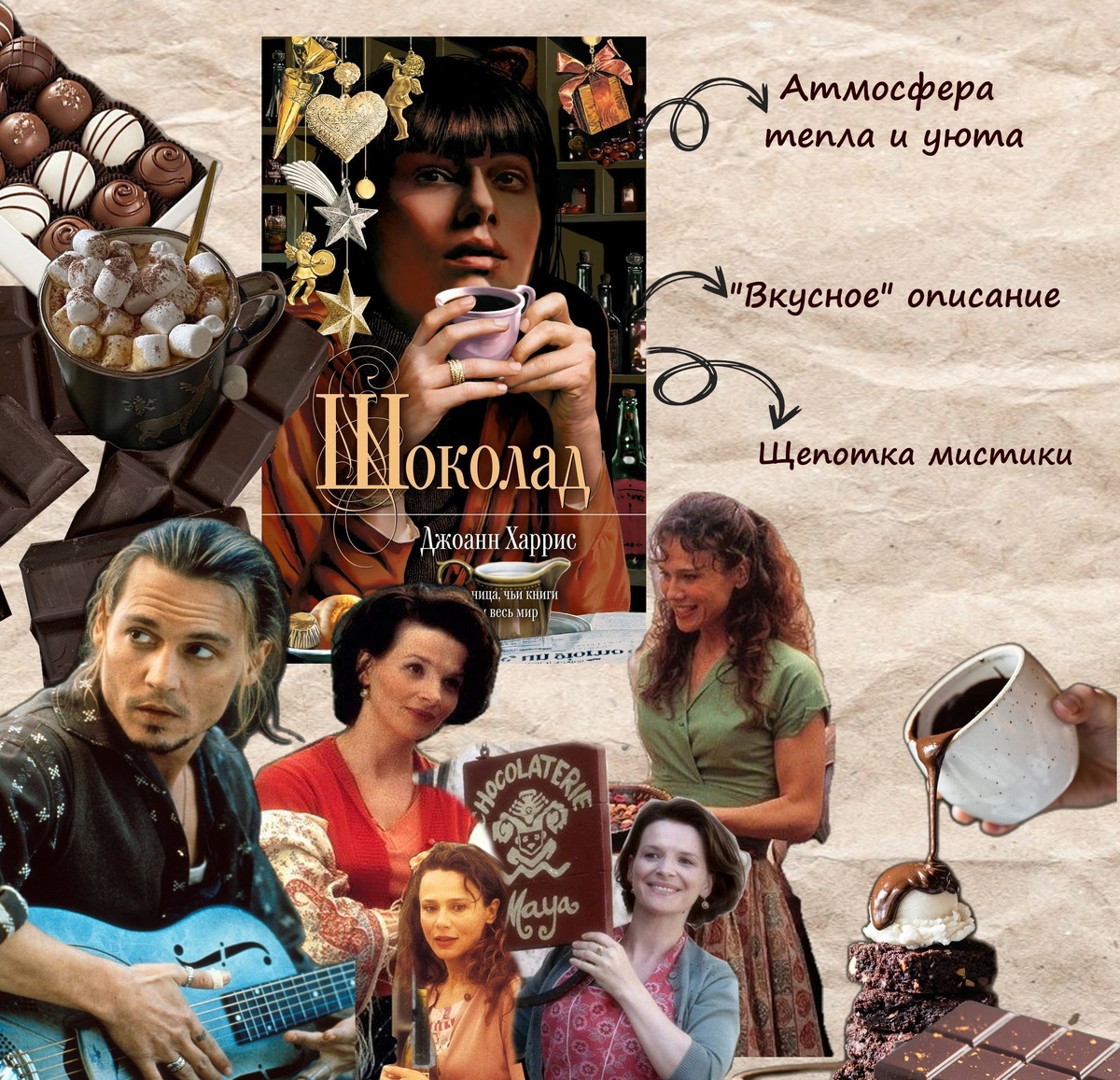 📖 «Шоколад» — Джоан Харрис Есть книги, которые словно пахнут корицей и свежевыпеченными булочками. «Шоколад» — именно такая история. Она уютно укутывает тебя словами, словно мягкий плед, и на страницах словно тает аромат какао. В центре сюжета — Вианн Роше, таинственная женщина, которая вместе с дочкой Анук приезжает в маленький французский городок. Они открывают шоколадную лавку, полную сладких чудес, и с этого момента привычный уклад городка начинает меняться. Каждая страница будто пропитана запахом горячего шоколада, специями и теплом: Вианн не просто продаёт сладости — она дарит людям возможность взглянуть на свою жизнь по-новому, найти утешение или решиться на перемены. Но уют в этой истории не без оттенка грусти. Городок консервативен и закрыт, жители настороженно относятся к Вианн и её лавке, а старые тайны и предрассудки не дают покоя. На этом фоне особенно ярко ощущается контраст: ароматное тепло шоколадной лавки против холодных взглядов и серости улиц. Для меня эта книга — с