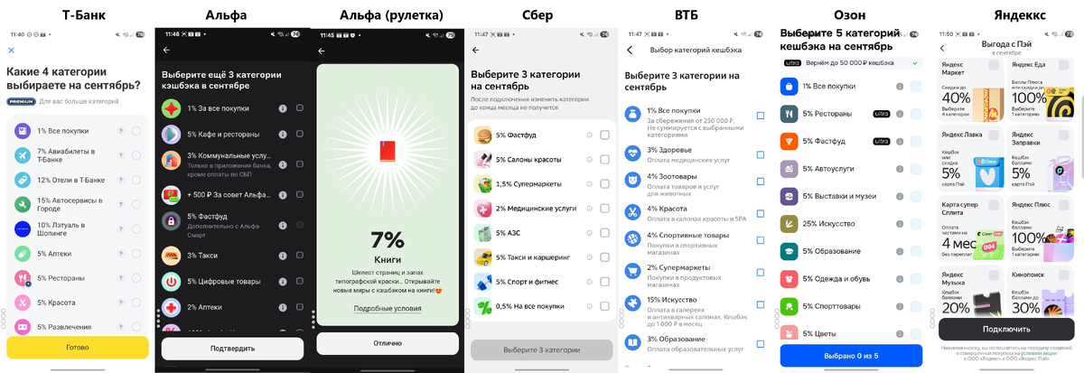 | Категории | Т-Банк | Альфа | Сбер | ВТБ | Озон |