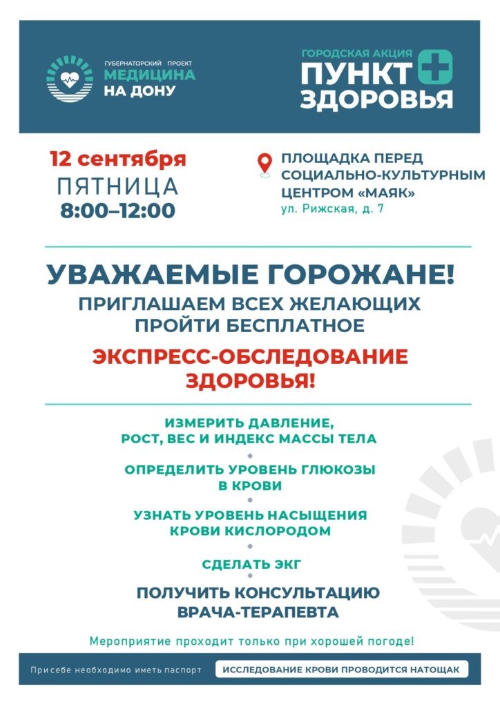 В рамках губернаторского проекта «Медицина на Дону» любой желающий сможет пройти бесплатный чекап 12 сентября с 08:00 до 12:00 на площади социально-культурного центра «Маяк»Обследование включает: антропометрия пульсоксиметрия измерение артериального давления исследование крови на глюкозу проведение ЭКГ. После чекапа можно будет проконсультироваться с терапевтом. Не забудьте взять паспорт и приходить натощак для анализа крови. Регулярные проверки здоровья помогают выявить риски заболеваний и принять меры для их профилактики.