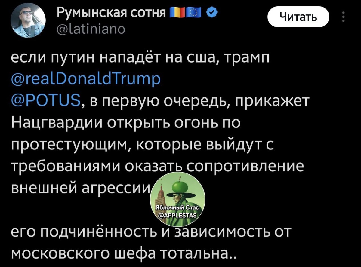 Новый день – новый цыганский приговор Доне. А с чего, кстати, Путину нападать на США? Пусть они там лучше распадутся на несколько десятков маленьких, но гордых стран. Техас заберет Мексика, Канада – северные штаты. Кроме Аляски, конечно. Там референдум проведем. Яблочный Стас