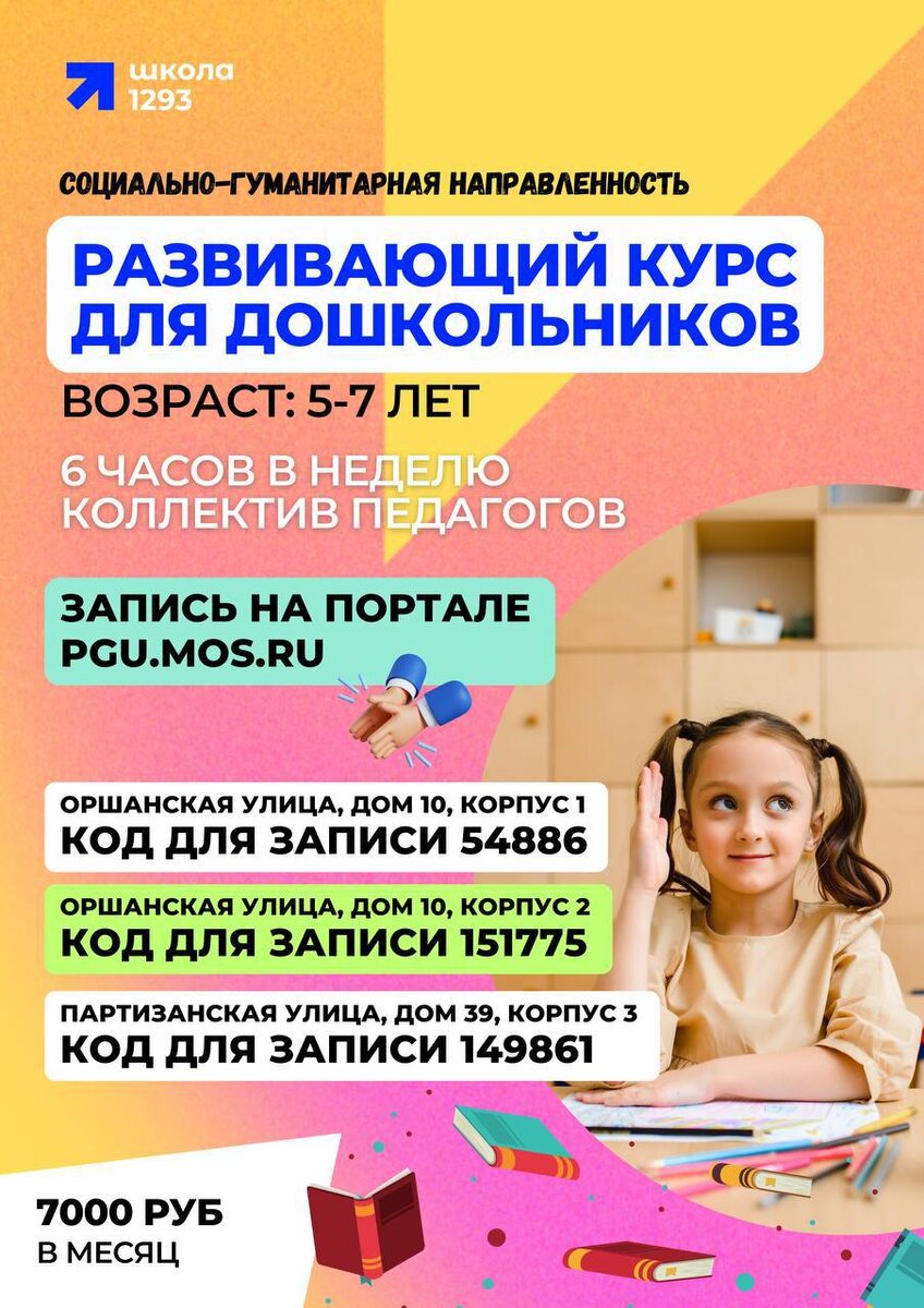 📚 ПОДГОТОВКА К ШКОЛЕ! 📖 Школьные годы – чудесный период в жизни каждого человека. Именно в школе мы находим себе друзей, учимся общаться со старшими и постигаем различные науки. Отправляя ребенка в первый класс, родителям будущих первоклассников стоит убедиться, готов ли малыш к школе. Приглашает🧒🏼мальчишек и 👧🏽девчонок в возрасте от 5 до 7 лет на детские объединения по подготовке к школе! Запись на портале mos.ru 📝 ⚡Оршанская улица дом 10, к. 1 - КОД ДЛЯ ЗАПИСИ 54886 ⚡Оршанская улица дом 10, к. 2 - КОД ДЛЯ ЗАПИСИ 151775 ⚡Партизанская улица, дом 39 - КОД ДЛЯ ЗАПИСИ 149861 Ждём Вас в #Школе1293 #ДОНМ | #ШколыКолледжиМосквы | #ДопОбразование | #Школа1293 | #РайонКунцево | #ШколаКунцево | #ЗАО | #ДополнительноеОбразование