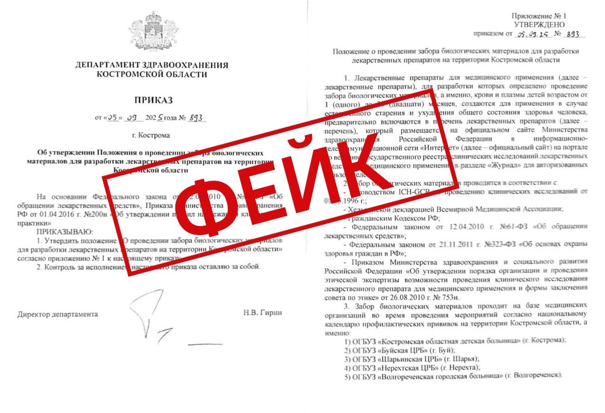 Фейковые документы от областного департамента здравоохранения костромские родители получили в родительских чатах В Костромской области родителей запугали медицинскими экспериментами с кровью малышей. Как выяснилось, информация — всего лишь фейк. В родительских чатах региона распространился документ якобы от департамента здравоохранения Костромской области со ссылкой на Минздрав и подписью директора данной инстанции Николая Гирина, который, к слову, не работает в данной должности с 2024 года. В документе говорится, что ряд медицинских учреждений региона: Костромская областная больница, Буйская, Шарьинская и Нерехтская ЦРБ, а также Волгореченская городская больница, будут осуществлять сбор крови у детей в возрасте от одного до двадцати месяцев для создания вакцины от старения. Как рассказали в ОГБУЗ Дом ребенка Костромы, документ является фейком. Также сотрудники организации призвали костромичей доверять только официальным источникам информации.