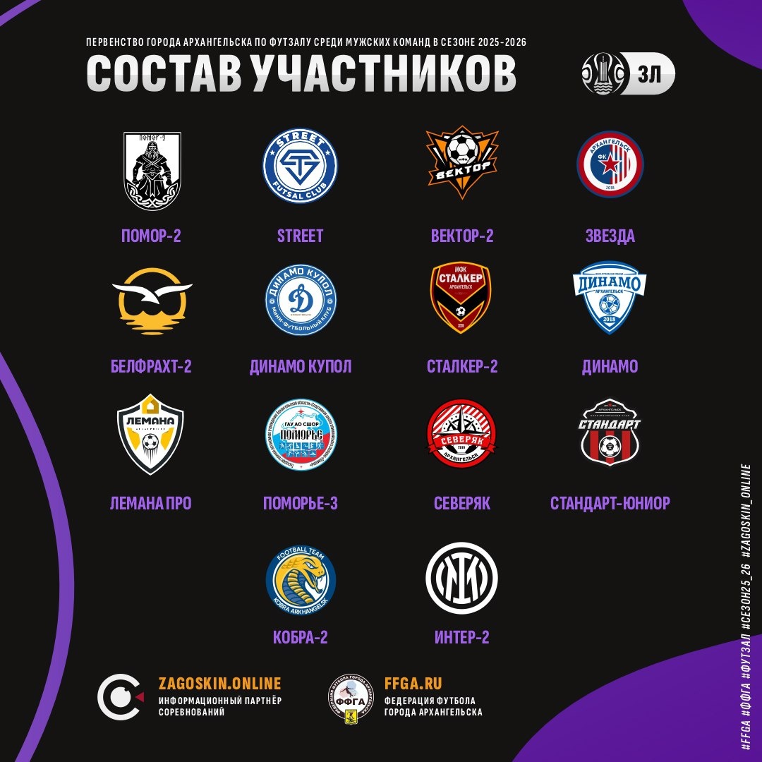 🔥 Предварительный состав участников | Третья лига В третьей лиге или лиге дублей прибавление. На начало сентября в третьей лиге насчитывается 14 команд, и не исключено, что состав ещё не окончательный. Видимо, в связи с обилием игроков, а также с повышением в классе, сразу несколько коллективов решили создать дублирующие команды: Белфрахт-2, Вектор-2, Интер-2, Кобра-2, Сталкер-2. В названии Лемана добавилось слово ПРО, вместо Поморье 2009 теперь Поморье-3. И наряду с уже знакомыми названиями команд появилось новое Динамо Купол. #zagoskin_online #ффга #футзал #перваялига #высшаялига #втораялига #третьялига #суперлига #сезон25_26