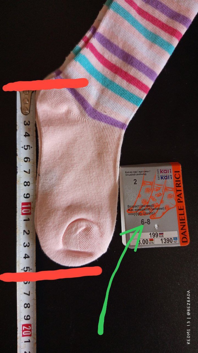 Про носки 👣 Вот на фото классический пример того, как делают носочно-чулочное. Размер на 6-8 лет, а длина — на ногу ребенка 4-5 лет (у моих сейчас длина стопы 16 см). С носками та же самая история. По ножке колготки чуть длинноваты (они на рост 128), но вот ещё момент: если брать по росту, то чаще всего колготки по животику тоже жмут! Дети при этом совсем не полные) С колготками, конечно, не очень удобно брать такую ростовку, но в целом нормально — небольшая гофра по бедру под платьем и всё 😉 С носками легче, конечно, но у них нужно ещё проверять резинку — визуально она не должна сужаться, тут на фото это отчётливо видно. Резинка должна быть той же ширины, что и остальной носок, а лучше вообще слабой — есть такие, а есть и совсем без резинки. Нет, ребенок при беге из них не вылетит 🤭 Зато не будет стягиваться естественное положение пальчиков, пережиматься микроциркуляция и сжиматься икра. Конечно, тут ещё вопрос к обуви — чтобы не было супинатора, мягкая и максимально гибкая