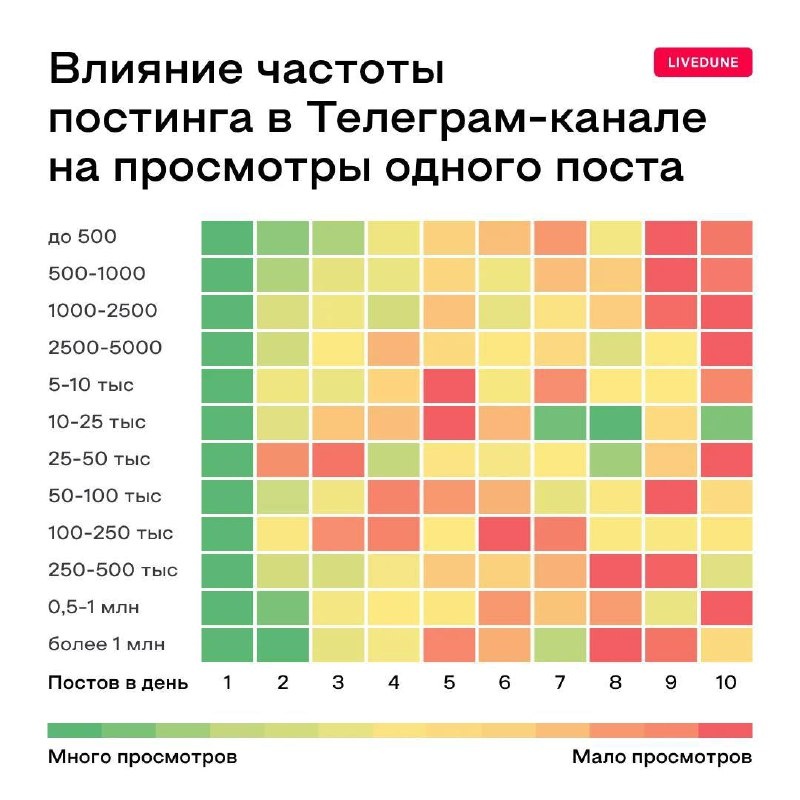 Как частота постинга влияет на охваты? Ранее публиковала видео с нашим опытом по этому вопросу. А вот и подоспело исследование 26 000 каналов в Telegram от сервиса Livedune, которое подтверждает наш опыт: «Очевидно одно – больше всего просмотров на пост собирают каналы, публикующие по одному посту в день. Предполагаем, что это связано и с тем, что уведомления у них отключают реже. Раз написали - значит что-то важное. С увеличением частоты постинга получается уже не так очевидно: ✅Два поста в день – средние просмотры на пост меняются, но не сильно. В среднем снижение составляет около 20%. ✅Три – у крупных каналов посты начинают уже смотреть реже, однако у остальных просмотры примерно такие же, как и при двух постах в день. ✅С четырех постов в день начинается более заметное снижение — на 30-40%. И далее тенденция начинает нарастать. ✅Восемь постов в день и больше — просмотры каждого поста уже ощутимо начинают падать. При этом у крупных каналов тенденция менее выражена - скорее вс