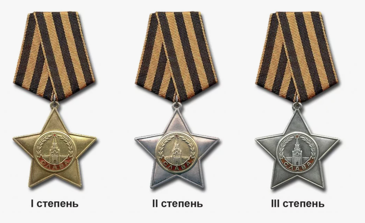 Орден Славы имеет три степени, из которых знак ордена высшей, I степени — золотой, а II и III — серебряные (у знака второй степени позолоченный центральный медальон). Согласно статуту ордена, награждения должны производиться в порядке строгой последовательности — от низшей степени к высшей.