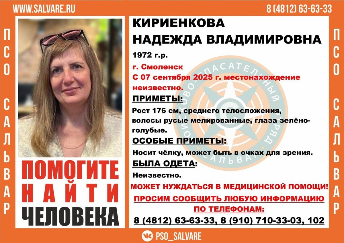 ❗️В Смоленске ищут 53-летнюю женщину, нуждающуюся в медицинской помощи 🔎Добровольцы ПСО «Сальвар» объявили о начале поисков Надежды Владимировны Кириенковой. С 7 сентября местонахождение женщины неизвестно. 📌Приметы: рост 176 см, среднее телосложение, волосы русые мелированные, глаза зелёно-голубые. 📍Особые приметы: носит чёлку, может быть в очках для зрения. 📲Информацию о местонахождении Надежды просьба сообщить по телефонам: 8 (4812) 63-63-33, 8 (910) 710-33-03, 102. 📷: ЧП Смоленск