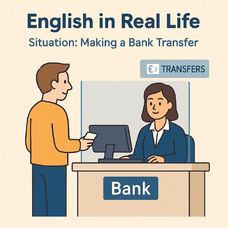 Situation: Making a Bank Transfer 🏦 Customer: Hi, I’d like to make a bank transfer, please. Здравствуйте, я бы хотел сделать банковский перевод. 👩💼 Clerk: Sure. Is it a domestic or international transfer? Конечно. Это внутренний или международный перевод? 🏦 Customer: It’s an international transfer to Germany. Международный, в Германию. 👩💼 Clerk: Okay. May I have the recipient’s full name and IBAN? Хорошо. Назовите, пожалуйста, полное имя получателя и его IBAN. 🏦 Customer: Yes, the name is Lisa Kraus, and here’s the IBAN. Да, имя — Лиза Краус, вот IBAN. 👩💼 Clerk: Thank you. How much would you like to send? Спасибо. Какую сумму вы хотите отправить? 🏦 Customer: €250. 250 евро. 👩💼 Clerk: There will be a transfer fee of €5. Is that okay? Комиссия составит 5 евро. Подходит? 🏦 Customer: That’s fine. Can I pay from my savings account? Да, подходит. Могу оплатить со своего сберегательного счёта? 👩💼 Clerk: Of course. Please confirm the details on the screen. Конечно