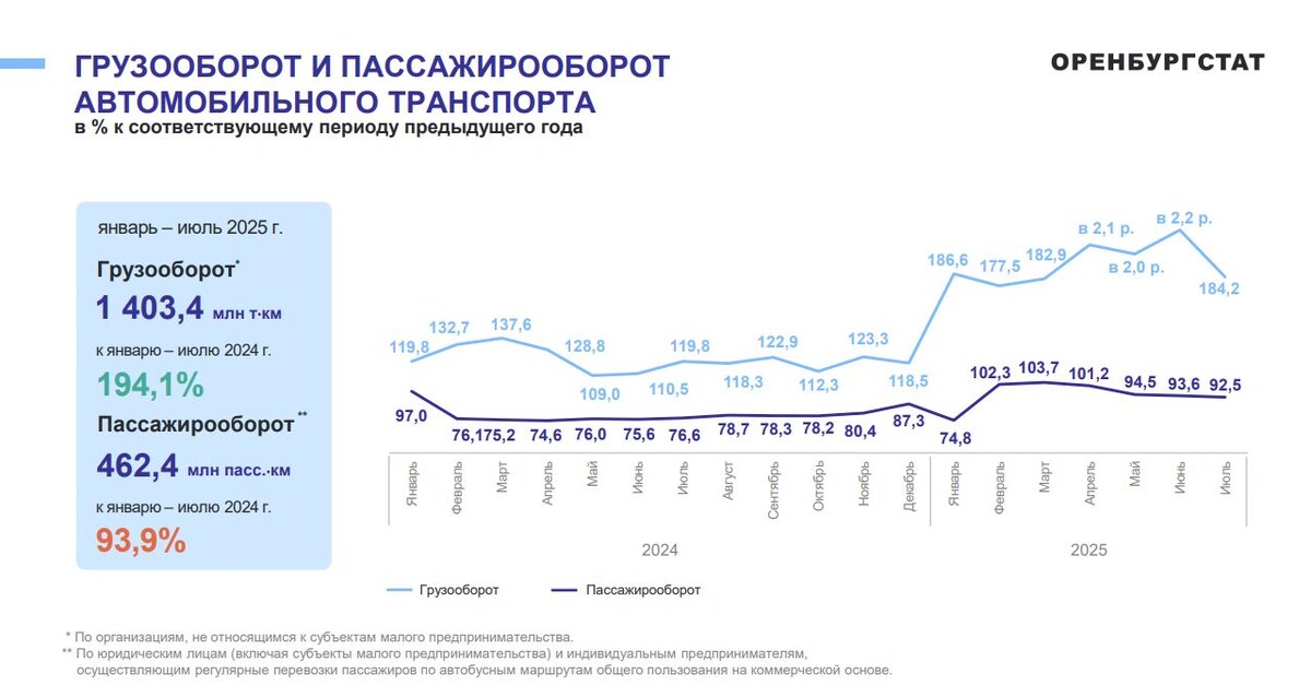Территориальный орган Федеральной службы государственной статистики по Оренбургской области (Оренстат) опубликовал информацию о работе транспорта Оренбургской области. Специалисты ведомства сравнили, сколько людей и грузов было перевезено в первом полугодии 2025 года (по сравнению с первым полугодием 2024). Результат вы видите на графике. Выходит, что объем пассажироперевозок снизился на 6,1% (при том, что в 2024 он буквально обрушился по сравнению с 2023 годом на 20% с лишним — то есть это процесс планомерный, что мы, в общем, и так на себе ощущаем). При этом объем грузоперевозок подскочил почти вдвое: по сравнению с первым полугодием прошлого года он вырос на 94,1% (в 2024 году по сравнению с 2023 рост был очень значительным, но не таким мощным — около 20%).