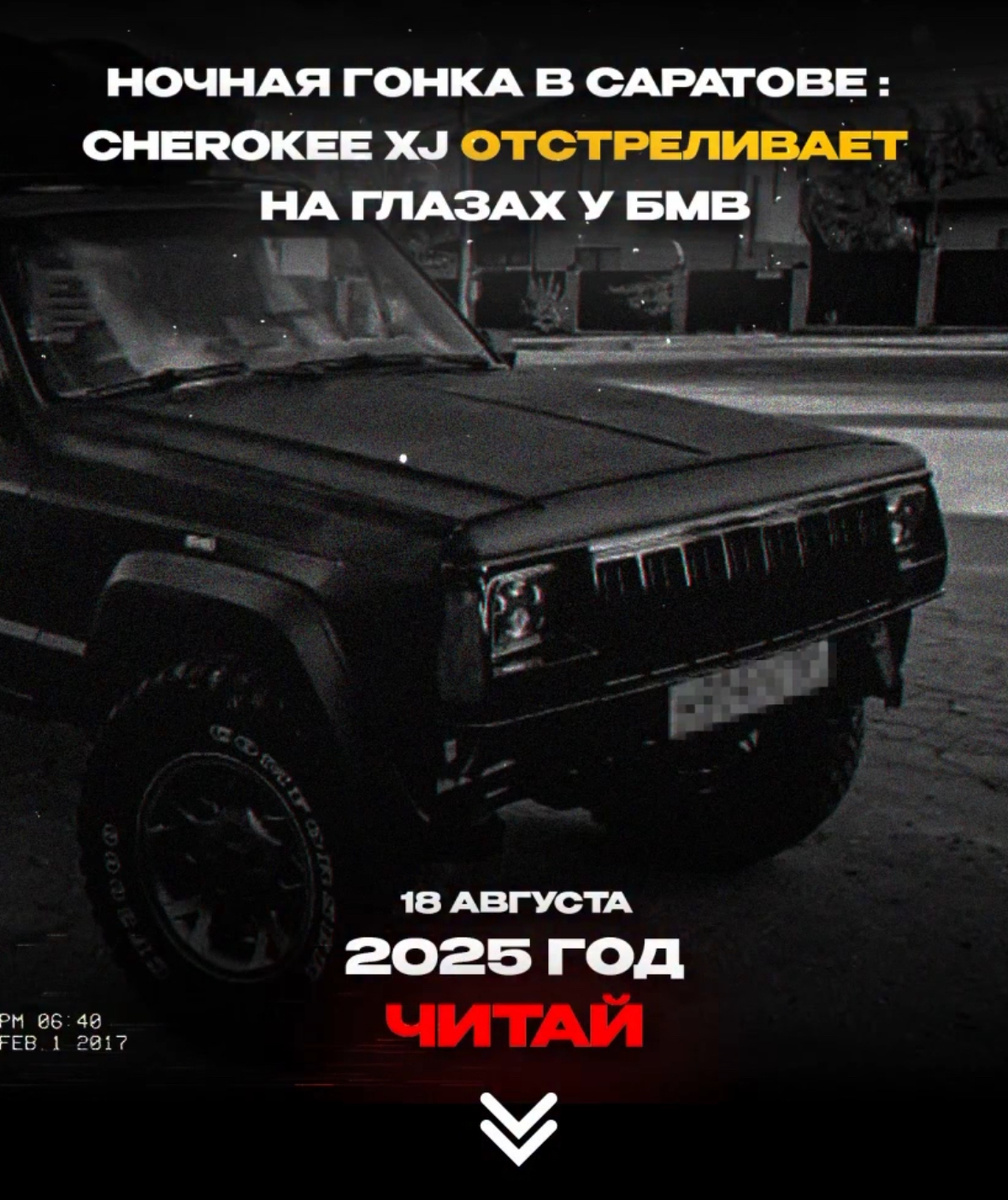 Саратов. 18 августа 2025 года. Поздний вечер, улицы мокрые от внезапного дождя. Фонари отражались в лужах, а воздух был пропитан запахом бензина и резины. На пересечении улиц Радищева и Московской появился черный Jeep Cherokee XJ, старый, но ухоженный, с выхлопом, из которого раз за разом вылетали яркие искры. Машина словно стреляла в ночь. Водитель заметил черный BMW 3-й серии, медленно ползущий по пустой улице. Он дал газу — Cherokee рванул вперед, выхлоп хлопал, как пистолет, а колёса разбрасывали воду из луж. Началась уличная дуэль: Jeep против BMW, перестроения через два ряда, ближе к бордюру, почти касаясь бамперов. На повороте к мосту через Волгу Cherokee сделал резкий манёвр: водитель резко бросил руль вправо, колёса подпрыгнули на кочке, искры из выхлопа осветили асфальт, а BMW вынужден был резко сбросить скорость, чтобы не врезаться. Черный Cherokee вырвался вперёд, пролетел по набережной с огненными вспышками из трубы и, едва не врезавшись в стоящий микроавтобус, све