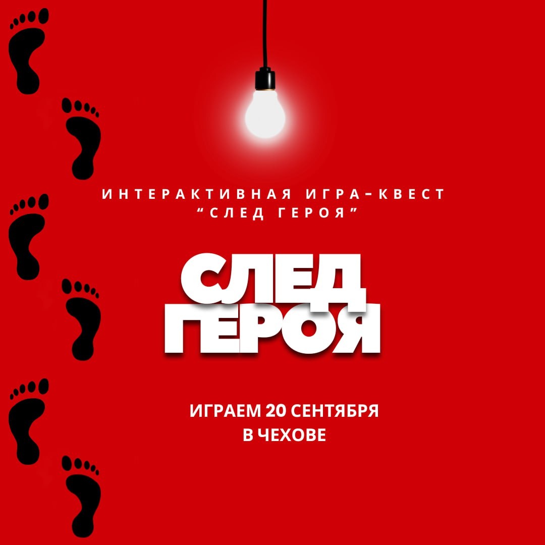 Первую игру играем 20 сентября (суббота), старт в 11.00 Запись команд началась! Еще есть места! Спешите! ТОЖЕ ХОЧУ ЗАПИСАТЬСЯ (https://t.me/anna_ancho) 👣 «След героя» - игра, где команды участников (команда состоит из 1 или 2 человек) выполняют различные задания, путешествуя по Чехову и окрестностям. Основная цель игроков - добраться до финиша с наибольшим количеством жетонов, проходя при этом испытания и выполняя задания на маршруте на время, выносливость, логику, ум и сообразительность. Участники принимают непростые решения и получают шанс продемонстрировать свои лучшие человеческие качества и проверить себя. В конце игры, на финале (финише), подсчитываются жетоны команд, выигрывают те, у кого больше всех жетонов – это 1 место! Победитель получает главный денежный приз. Обратите внимание - призом будут деньги! ➡️На маршруте игры 20 сентября будет несколько локационных точек: 👣 Музей Усадьба Лопасня-Зачатьевское 👣 Чеховская Центральная библиотека (https://vk.com/chehovcb) 👣 Г