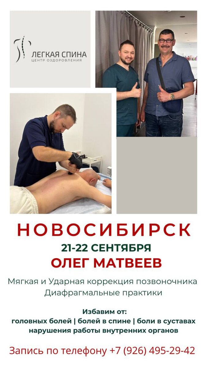 💥НОВОСИБИРСК 💥БАРНАУЛ Олег Петрович Матвеев после обучение диафрагмальным практикам снова отправляется в путь. 📍 НОВОСИБИРСК - 21-22 сентября 📍 БАРНАУЛ - 23 сентября Как работают диафрагмальные практики? 🖇️ Человека нельзя делить по частям и, например, устранять боль в ноге без понимания, почему и как она возникла Диафрагмы соединяются между собой и поддерживают органы, мышцы, суставы, через них также проходят сосуды и нервы 🖇️ Пример: Наша главная диафрагма — грудобрюшная, через нее проходят пищевод и желудок. Если она в спазме, это приводит к изменению положения желудка и привратника. ➡️ Появляются вздутие живота, грыжа пищевода, пища гораздо хуже переваривается, в желудке остаются непереваренные остатки и т.д. Как следствие, развивается гастрит, язва. Мы пытаемся помочь пищеварению таблетками, а нужно всего лишь, отработав с грудобрюшной диафрагмой, снять напряжение с желудка. ✍️ Записывайтесь на прием к Олегу Петровичу в регионах по телефону +7 (926) 495-29-42