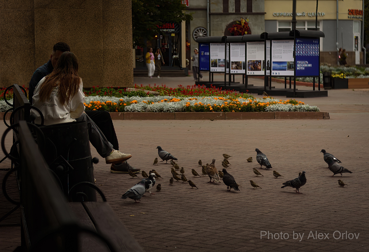 Простите за нескромность. Наверное соглашусь с организаторами и посетителями выставки, говорившими во время открытия, мол светлый человек, потому и фотографии у него получаются добрые. Проникнутые любовью к людям. Приятно такое слышать. Хотя если честно, ранее даже и не задумывался почему так. Вот, к примеру, люди сидят на лавочке, просто сидят. Спиной к камере. Вроде бы и ничего особенного. Ан нет. Если бы не их действие - кормление птиц. Наверно пустой, никчемный кадр был бы. А тут появилась настроение. Или другим словом - атмосфера. Кстати, до чего же не люблю это слово. К месту и не к месту вставляемые зрителями. Настроение, характер, жизнь - да. Но атмосфера... извините, не понимаю. Так вот, Скорее всего чувствую и отношусь к тому, что снимаю, по доброму. Чисто интуитивно. Желание показать если не красоту человека, то красоту его действия, его роли в кадре. Скорее всего именно это для меня главное.