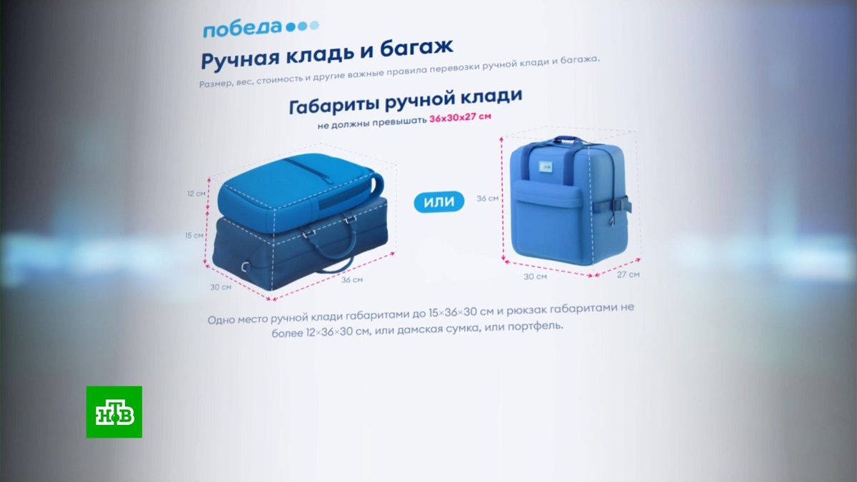 [ Смотреть видео на сайте НТВ ] Авиакомпания «Победа» увеличила размер ручной клади, которую можно брать с собой на борт. Он теперь составляет 15х36х30 сантиметров. Также сняты ограничения по весу. Лоукостер «Победа» изменил правила провоза ручной клади. Выполняя постановление суда, компания сняла ограничения по весу и увеличила размеры сумок, которые можно взять с собой на борт. Габариты одного места ручной клади теперь 15х36х30 сантиметров, а не 4х36х30 сантиметров, как было раньше. Пакет с товарами из duty free, который можно взять с собой вместе с другими вещами, тоже прибавил в размерах: раньше он не мог превышать 10х10х5 сантиметров, теперь — 24х32х10 сантиметра. Помимо сумок или рюкзаков, в салон можно пронести ноутбук или планшет в мягком чехле, а также зонт-трость, букет цветов или костюм в портпледе без дополнительной оплаты. Кроме них, в список исключений попадают ходунки, складные кресла-каталки, роллаторы и костыли. В этом году российская прокуратура обратила внимание на ж