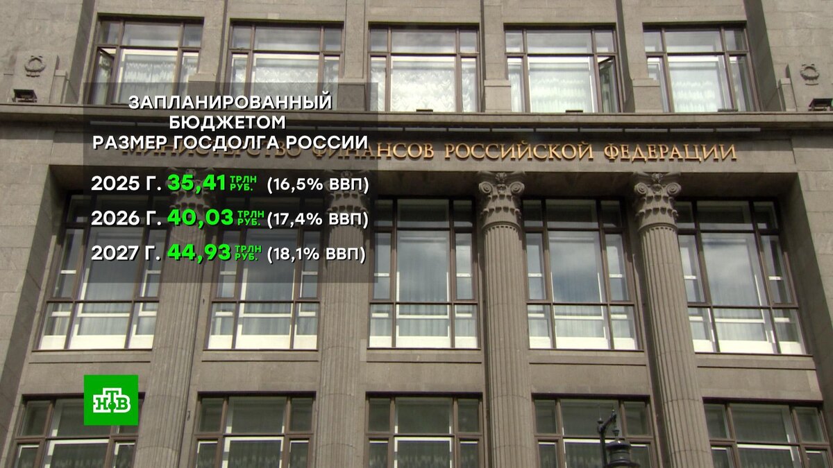 [ Смотреть видео на сайте НТВ ] В этом году Минфин РФ будет дополнительно наращивать заимствования относительно запланированного уровня. Министр финансов Антон Силуанов допустил, что в этом году российский государственный долг окажется выше, чем пока запланировано. Об этом он рассказал в эфире Радио РБК, добавив, что процесс будет происходить: «в пределах разумных увеличений» и, по словам Антон Силуанова, не создаст больших дисбалансов для бюджета. Сейчас в бюджете прописано, что в этом году российский госдолг должен составить примерно 35,5 трлн рублей, то есть это 16,5% ВВП. К 2027 году по плану госдолг должен вырасти почти до 45 трлн рублей. Именно государственные заимствования Минфин называл основным источником финансирования дефицита бюджета в 2025–2027 годах. Нынешний госдолг России Антон Силуанов назвал небольшим и оценил его чуть меньше 15% ВВП. Однако для наращивания госдолга, указал министр финансов, есть сразу несколько ограничителей. Во-первых, внешних инвесторов в России се
