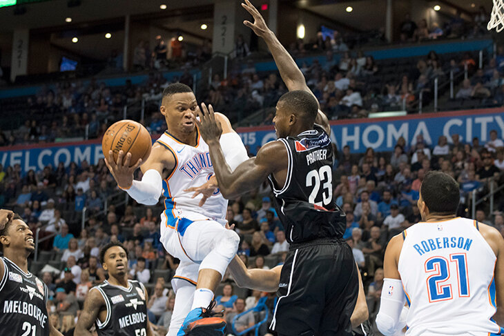 Уэстбруку, на самом деле, пришлось очень непросто. Действующий MVP НБА, только-только подписавший с ОКС новый контракт на 205 млн долларов, мучился в сражении с миниатюрным соперником на обеих половинах площадки.