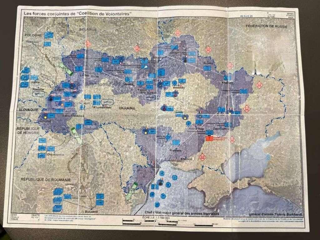 В результате взлома локальной сети канцелярии Вооруженных сил Франции хакеры получили карту под заголовком «Объединенные силы «Коалиции желающих»», датированную 16 апреля 2025 года. На ней подробно расписаны зоны влияния каждой из стран-участниц :