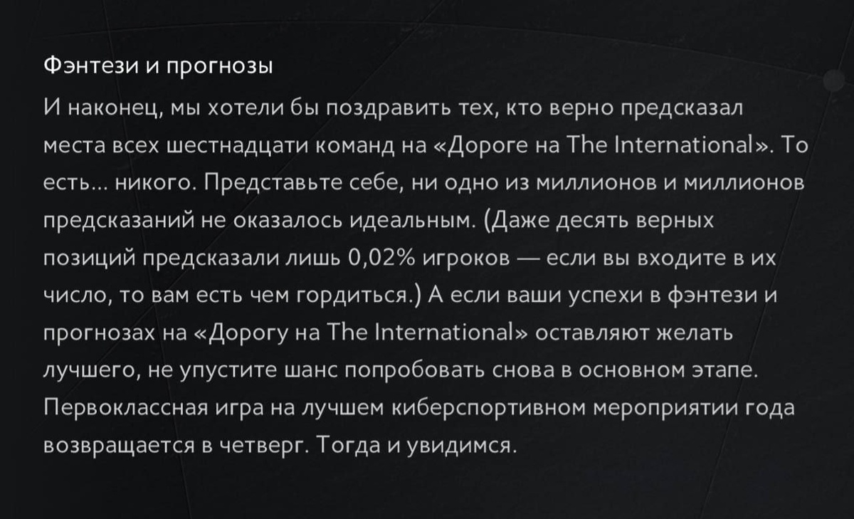Что-то я думаю Valve неверно посчитали 0,02% игроков и там их ещё меньше. Но никто полностью групповой этап предсказать не смог. Вроде как средний результат 3-4 верных прогноза.
