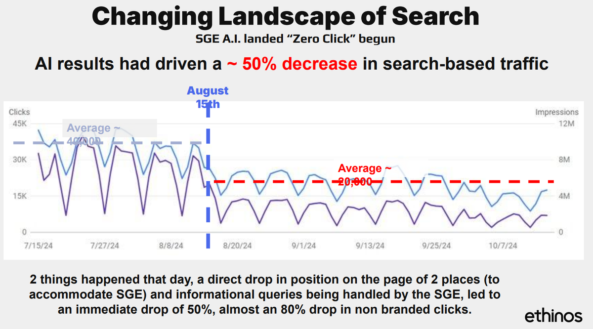 Google официально представил AI Overviews в США 14 мая 2024 года, а три месяца спустя ответы ИИ в выдаче стали доступны еще в шести странах. После этого сайты столкнулись с резким падением трафика несмотря на то, что позиции в органике остались прежними. Бенедикт Хейс, исполнительный директор Ethinos, в своем докладе на India SEO Conference 2025 демонстрирует резкое сокращение переходов на сайт после 15 августа: