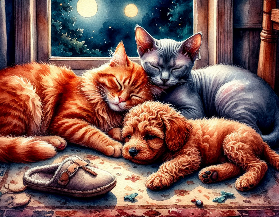 Ночью наш дом обычно дремлет. Кошки сворачиваются клубками, щенок сопит в своей подстилке, а Хозяйка укрывается одеялом с головой. Но сегодня маленькая Буся решила, что ночь создана вовсе не для сна. И тишине пришёл конец. Часы показывали три ночи. В квартире было тихо, только часы на кухне отмеряли секунды. Буся проснулась первой. Потянулась, услышала собственный смешной хлюпающий зевок и вдруг заметила хвост. Он так заманчиво шевельнулся, что устоять было невозможно. Щенок бросился за ним и начал кружиться по ковру. — Ты с ума сошла? — донеслось с кресла. Грета приподняла голову и сузила глаза. — Три часа ночи! Даже воробьи спят. — Но хвост убегает! — с восторгом ответила Буся и ещё быстрее завертелась, врезавшись в ножку стола. Грета закатила глаза и подтянула хвост к себе. — Я умная кошка. Я сплю. Попробуй когда-нибудь. На подоконнике сонно завозился Гектор. Он спрыгнул вниз, шлёпнулся на ковёр и спросил: — А если она всё-таки поймает хвост? Что потом? — Потом… — Грета многозначи
