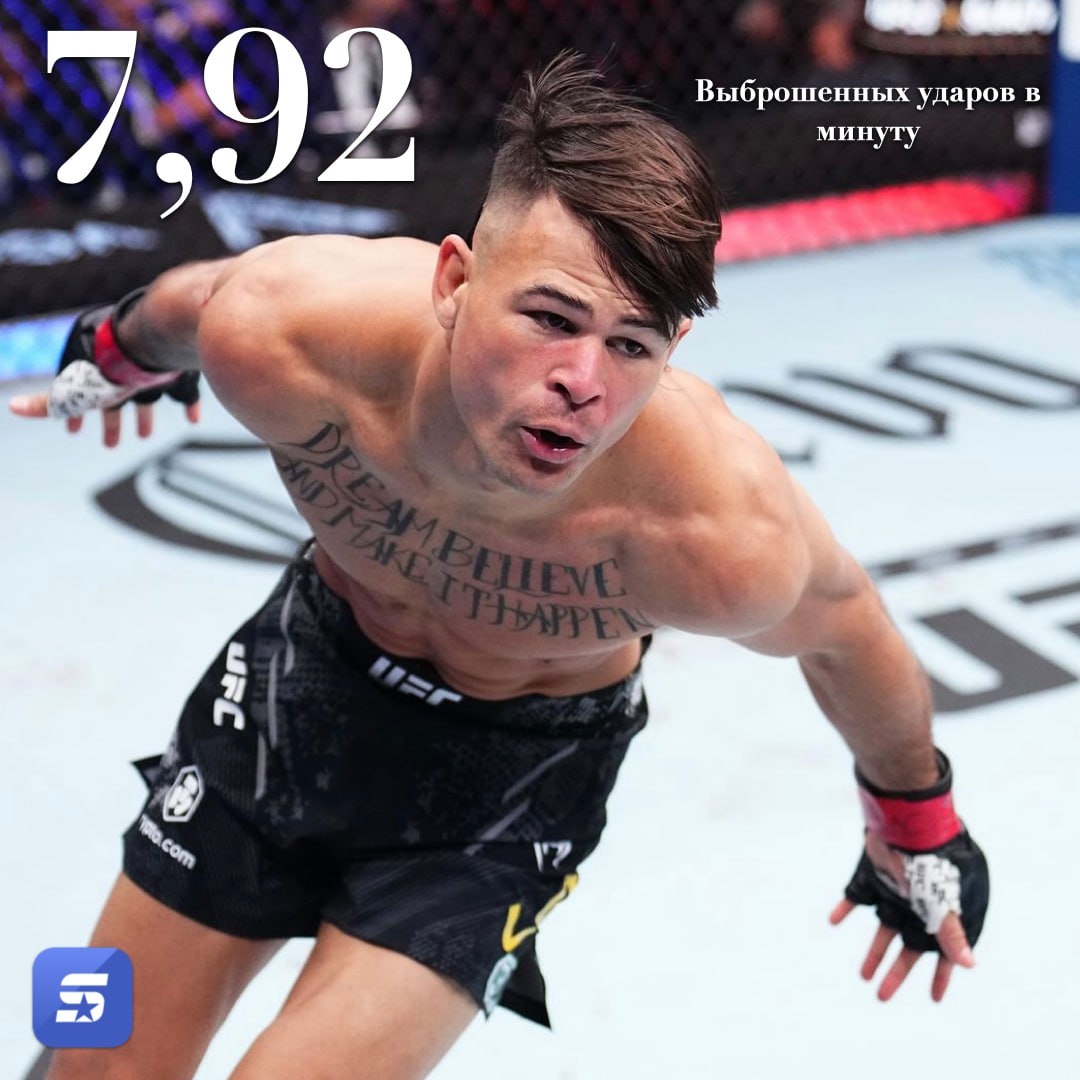 🔥 Диего Лопес — настоящий мотор! В среднем он выбрасывает 7,92 удара в минуту — это всего на 0,24 больше, чем у его соперника в главном бою на #NocheUFC, Джина Сильвы. 💥 Но станет ли эта интенсивность решающим преимуществом для Диего?