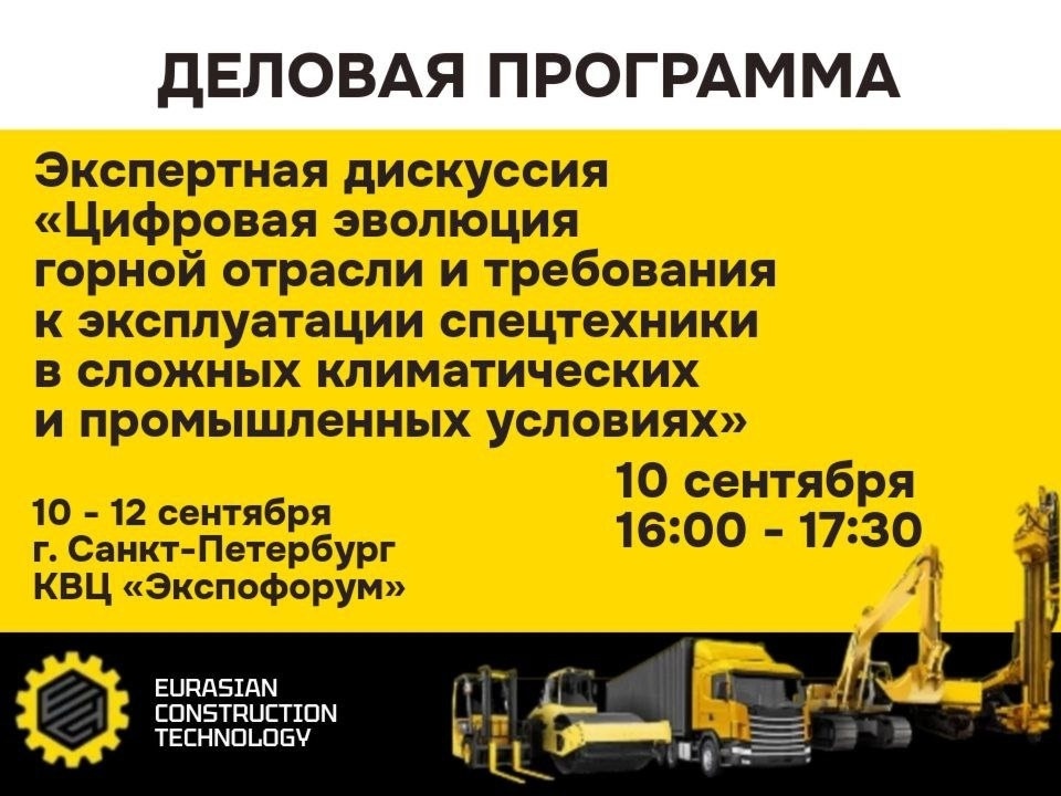 10 сентября, в первый день проведения выставки-форума Eurasian Construction Technology 2025, состоится экспертная дискуссия «Цифровая эволюция горной отрасли и требования к эксплуатации спецтехники в сложных климатических и промышленных условиях». Участники обсудят: — практические кейсы, технологические горизонты и системный подход к цифровизации горного производства; — особенности работы китайской техники на российских объектах, сравнение с западными аналогами, новые форматы сервиса, практику «механизации без простоев» и подходы к созданию устойчивой инфраструктуры поддержки в полевых условиях. Модератор: Юрий Сергеевич Иванов, заместитель генерального директора «МайнКраш». Подтвержденные спикеры: — Дмитрий Владимирович Пластинин, эксперт по организационно-техническому развитию предприятий горно-металлургического комплекса, управляющий партнер, Ре Металика. — Шигаюпов Филипп Александрович, генеральный директор «МайнКраш»; — Ракитин Илья Витальевич, руководитель технического департамен