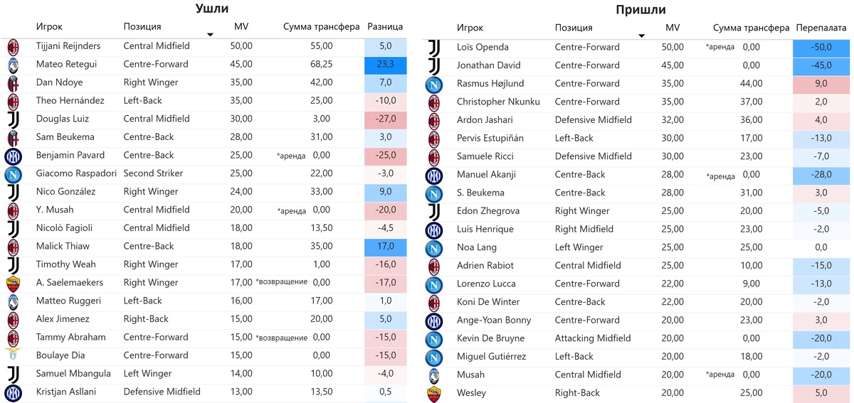 За самое мощное укрепление состава (по оценкам MV от transfermarkt) больше всех заплатил «Наполи» – трансферный баланс минус 111 млн. € (почти половина отрицательного баланса за счет последних трех дней), зато в MV выросли на 30 млн больше – добавили 141 млн. € к рыночной стоимости. «Рома» и «Интер» сильнее закупались в основной состав (минус 48.5 и 47 млн. €), чем продавали и за счет трансферов увеличили рыночную стоимость команд (36 и 42.5 млн. €). Остальные четыре клуба скорее зарабатывали на трансферах игроков обоймы команды прошлого сезона. «Ювентус» больше всех заработал, при этом не потерял в стоимости игроков текущего состава. «Болонья» продала двух своих лидеров и заработала 30 млн. на трансферах, но потеряла в стоимости игроков в составе (-39.8 млн. €). «Аталанта» продала лучшего нападающего Серии А (Матео Ретеге) в Саудовскую Аравию и вышла в плюс на 25 млн. «Милан» продал на самую большую стоимость – 163.5 млн. € и выручил чистыми 10 млн. € (с учетом не основных игроков – вышли примерно в нулевой баланс), при этом набрали 8.3 млн. в MV, в финансовом и рыночных расчетах размен выглядит неплохим, как минимум равнозначным. Обзор трансферов топ-4 клубов по стоимости игроков: