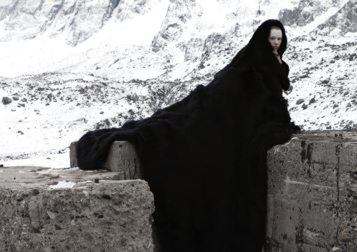 Зима на заднем плане, черный плащ во всю ширину кадра, и крошечное лицо, как точка отсчета. Матиас Тронкосо любит, когда фигура и пространство разговаривают на равных: модель не растворяется в пейзаже, а будто спорит с ним. Холод и тишина делают кадровую паузу длиннее, зритель задерживается и начинает рассматривать фактуры. Камень шершавый, ткань мягкая, взгляд прямой. Эффект простой: визуальная притча о хрупкости, которую можно укутать, но не заткнуть.
