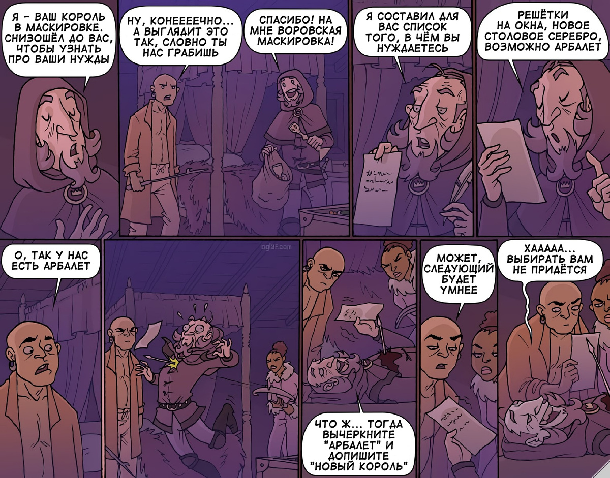 Мир веб-комиксов невероятно разнообразен, но лишь части проектов удается стать эталонными в своем жанре. Юмористическое фэнтези - особенно сложная ниша, где успех зависит от идеального баланса между узнаваемыми сюжетными тропами и качеством шуток. Одним из удачных примеров такого успеха по праву считается серия «Оглаф», которая уже много лет доказывает, что самый хулиганский юмор может одновременно быть и очень тонким. И сегодня вас как раз ждет несколько забавных комиксов из этой серии. Надеюсь, что они вам понравятся! Oglaf (англ. «Оглаф») - это серия юмористических веб-комиксов, созданная австралийским творческим дуэтом Труди Купер (Trudy Cooper) и Дага Бэйна (Doug Bayne). Серия дебютировала в 2009 году и с тех пор продолжает выходить на официальном сайте проекта. Новые выпуски, как правило, публикуются еженедельно, радуя постоянную аудиторию и привлекая новых поклонников. Структурно «Оглаф» представляет из себя небольшие сюжеты в несколько кадров (чаще всего - около 10). Темы варьи