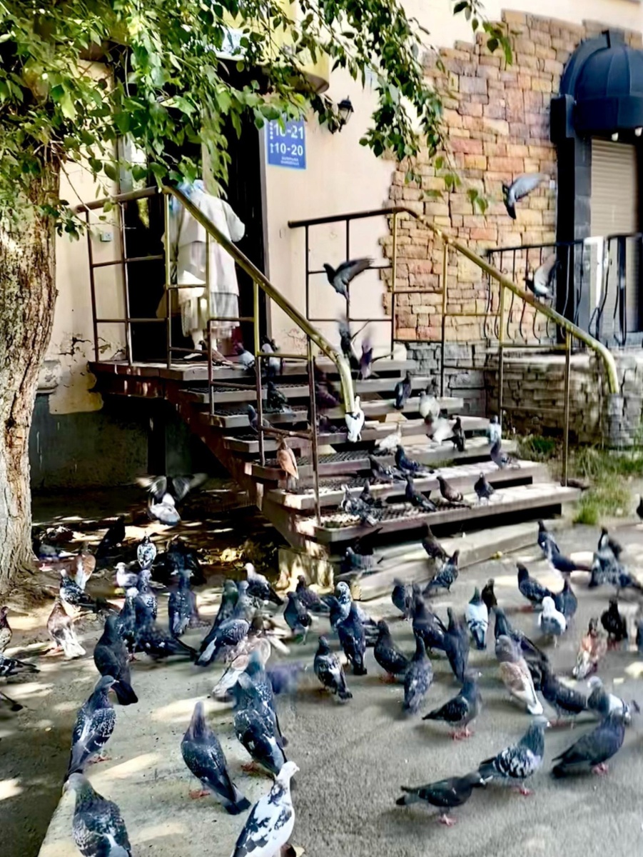 Братчане запечатлели голубей, покорно идущих за женщиной, словно за героиней из "Один дома" - птичницей.