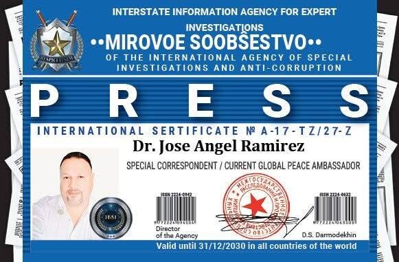 Специализированная международная автономная экспертно-аналитическая некоммерческая правоохранительная организация «Межгосударственное агентство по специальным расследованиям и борьбе с коррупцией», а также её подразделение — международное СМИ, Межгосударственный журнал «Мировое сообщество» (зарегистрированный в Международном центре ISSN, Париж, Франция, ISSN: 2224-0942, ISSN: 2224-0632), выражают глубокое уважение и сердечно поздравляют Dr. José Angel Ramirez с назначением на должность Специальный корреспондент / Действующий Посол мира. Dr. José Angel Ramirez — это выдающийся лидер, учёный и практик в области прав человека, чья деятельность заслуживает самого высокого признания. В качестве Президента и Международного Координатора IHRCG он осуществляет стратегическое руководство и глобальную координацию правозащитных инициатив. Под его началом Посольство и Национальная координация IHRCG в Мексике стали одним из ключевых центров по борьбе с насилием, коррупцией и безнаказанностью, а такж