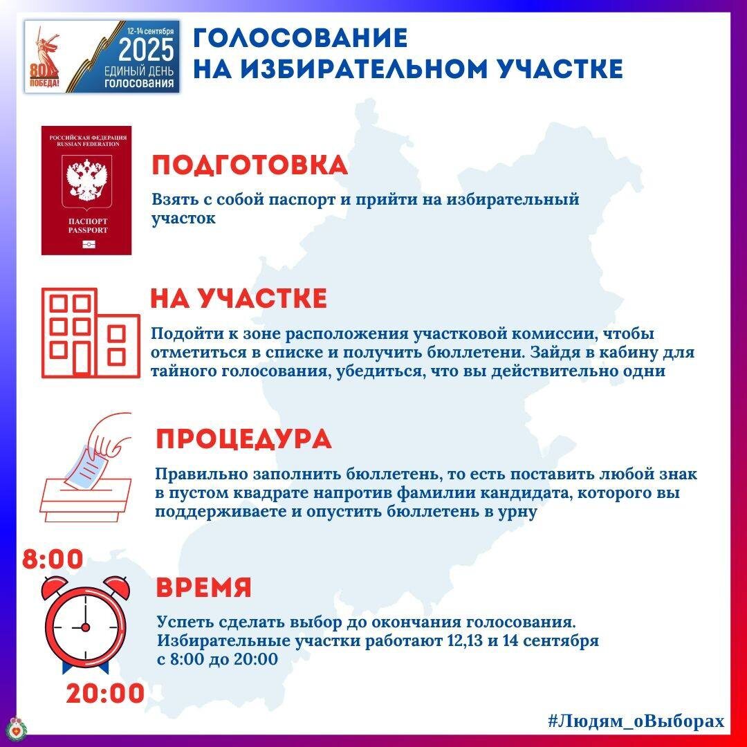 Как проголосовать на избирательном участке? Ответит рубрика #Людям_оВыборах 👨👩👧 Избирательный участок — это основной и самый распространённый способ участия в выборах. В дни выборов, с 12 по 14 сентября, приходите на избирательный участок и сделайте свой выбор. Участок будет работать с 8:00 до 20:00. Адреса УИКов мы публиковали ранее. Также адреса можно найти на портале Госуслуги в разделе «Выборы» и на сайте ЦИК России. 💡Стоит отметить, если в день голосования вы не сможете находиться на своём избирательном участке, то можно проголосовать на любом удобном избирательном участке в пределах вашего избирательного округа, подав соответствующее заявление с 3 по 8 сентября. Уже вчера все участки начали свою работу перед выборами: понедельник - пятница с 16:00 до 20:00, суббота - воскресенье с 9:00 до 13:00. Приходите на избирательный участок в удобные для вас дни голосования и сделайте свой выбор. ⚡️ При себе необходимо иметь паспорт гражданина РФ.