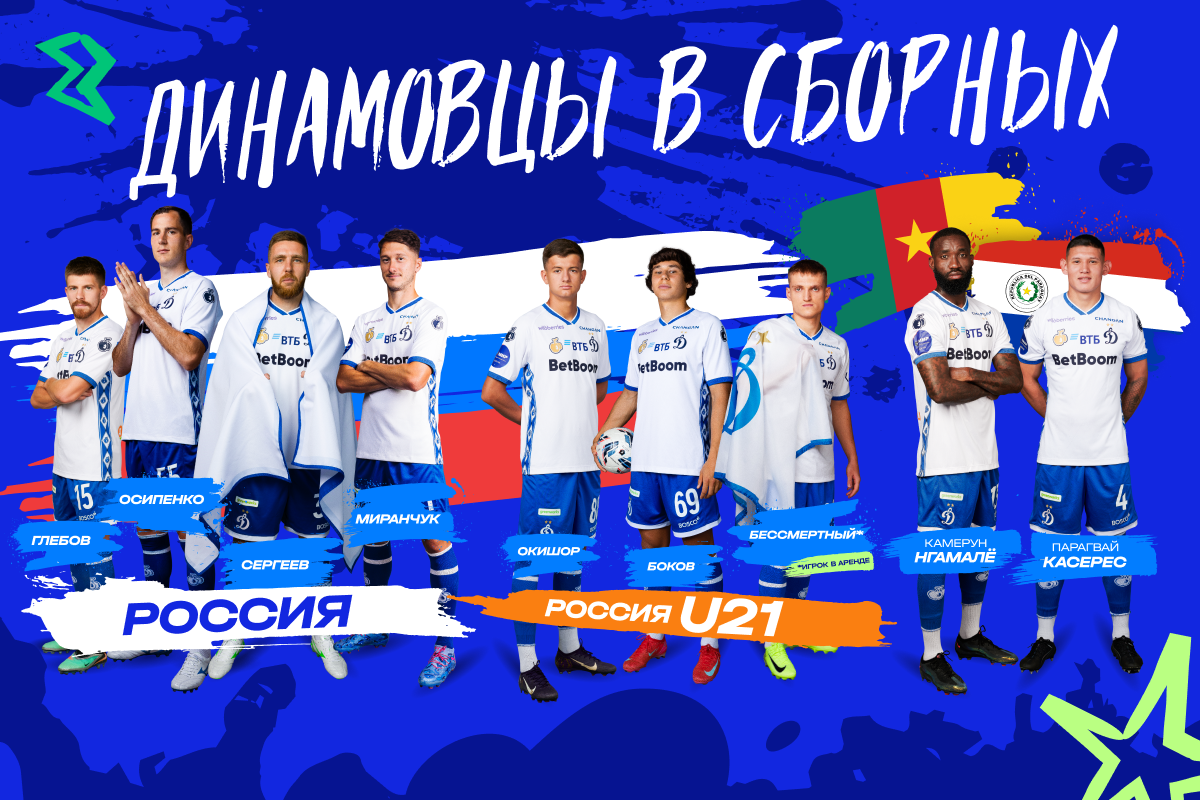 В расположение своих национальных команд отправились 9 динамовцев. В сентябре пройдут матчи отборочных турниров к чемпионату мира 2026 года и ряд товарищеских игр. Полное расписание матчей, везде указано московское время: РОССИЯ (Данил Глебов, Антон Миранчук, Максим Осипенко, Иван Сергеев) 4 сентября — Россия – Иордания (20:00, Москва) 7 сентября — Катар – Россия (18:15, Эр-Райан) РОССИЯ U21 (Денис Боков, Виктор Окишор, Станислав Бессмертный) 5 сентября — Россия U21 – Саудовская Аравия U23 (17:00, Химки) 8 сентября — Россия U21 – Саудовская Аравия U23 (14:15, Химки) КАМЕРУН (Николя Нгамалё) 4 сентября — Камерун – Эсватини (22:00, Яунде) 9 сентября — Кабо-Верде – Камерун (19:00, Прая) ПАРАГВАЙ (Хуан Касерес) 5 сентября — Парагвай – Эквадор (02:30, Асунсьон) 10 сентября — Перу – Парагвай (02:30, Лима)