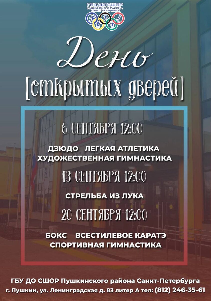 ⚡️Наша спортивная школа олимпийского резерва Пушкинского района приглашает на День открытых дверей: ➡️6 сентября - День видов спорта "дзюдо", "легкая атлетика", "художественная гимнастика". ➡️13 сентября - День стрельбы из лука ➡️20 сентября - День видов спорта "бокс", "всестилевое каратэ", "спортивная гимнастика". 🕛12:00 - открытое занятие 🕛12:30 - встреча с тренерами-преподавателями 📍Адрес: г. Пушкин ул. Ленинградская 83 литер А 👟Вход в сменной обуви 📞Дополнительная информация по телефону: (812)246-35-61 #ДеньОткрытыхДверей #ГБУДОСШОРПушкинскогорайонаСанктПетербурга