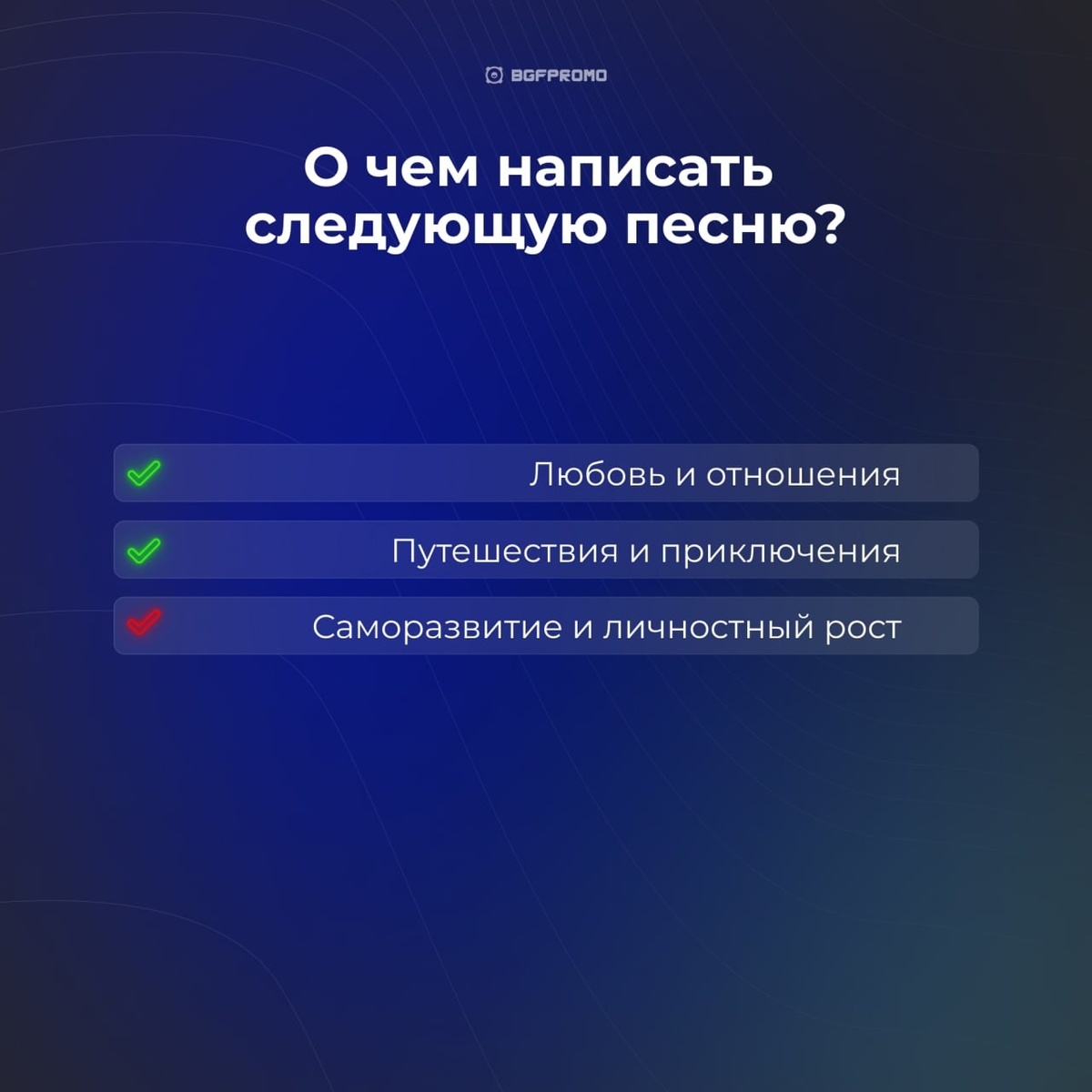 Каждый артист рано или поздно сталкивается с этим: вдохновения ноль, а трек выпускать надо. Ты листаешь стриминги, смотришь на тренды TikTok и думаешь: «Ну и о чём сейчас писать песни?». Мы в BGF Promo собрали 4 темы для треков, которые реально работают в 2025 году, попадают в плейлисты Яндекс.Музыки и Spotify, а в TikTok иногда выстреливают вирусно. Если ищешь, о чём написать песню, начни с настоящих эмоций. Слушатели до сих пор включают музыку, чтобы прожить расставания, предательства и «почему всё закончилось». Простые, честные тексты без сложных рифм идеально попадают в плейлисты «грусть/ностальгия» и разлетаются в TikTok, потому что каждый может приложить их к своей истории. 💡 SEO‑ключи: . Музыкальные тренды 2025 года показывают: топы стримингов забиты треками про ощущение свободы и лёгкости. Вечеринка, лето, друзья, ночной город — любая сцена, в которой хочется жить моментом. Здесь важен не столько текст, сколько вайб. Достаточно простой фразы и качающего бита, чтобы трек ушёл н