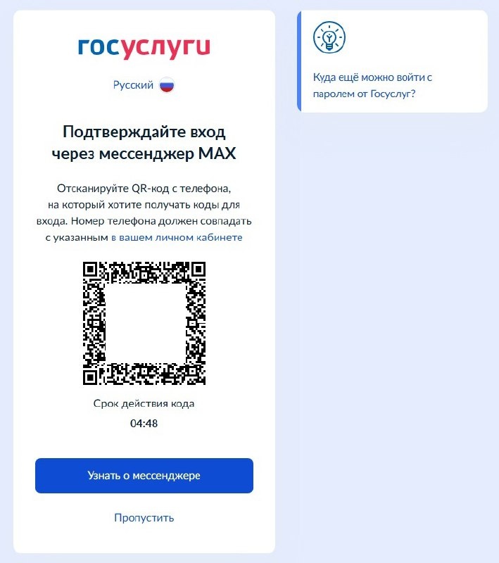 📱В Max загоняют через Госуслуги При каждой авторизации в ЕСИА (Госуслуги) высвечивается QR-код для подтверждения входа через мессенджер MAX. Выделенная синяя кнопка ведёт на страничку скачивания приложения. Административный ресурс в деле. Чтобы войти в Госуслуги, не устанавливая MAX, нужно нажать кнопку "Пропустить" в низу экрана.