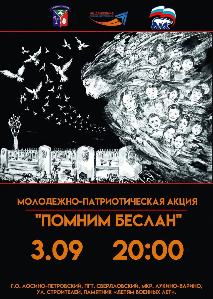 Помним Беслан: в городском округе Лосино-Петровский пройдёт памятная акция 🕯️ Ежегодно 3 сентября мы вспоминаем трагедию в школе №1 города Беслана 2004 года, где террористы захватили заложников, среди которых были и дети. Многие погибли. Этот день символизирует боль и солидарность в борьбе с терроризмом. 3 сентября в 20:00 у памятника «Детям военных лет» (мкр. Лукино-Варино, ул. Строителей, р.п. Свердловский) пройдёт молодежно‑патриотическая акция «Помним Беслан». Приглашаем всех присоединиться: зажжём свечи и почтим память погибших минутой молчания.