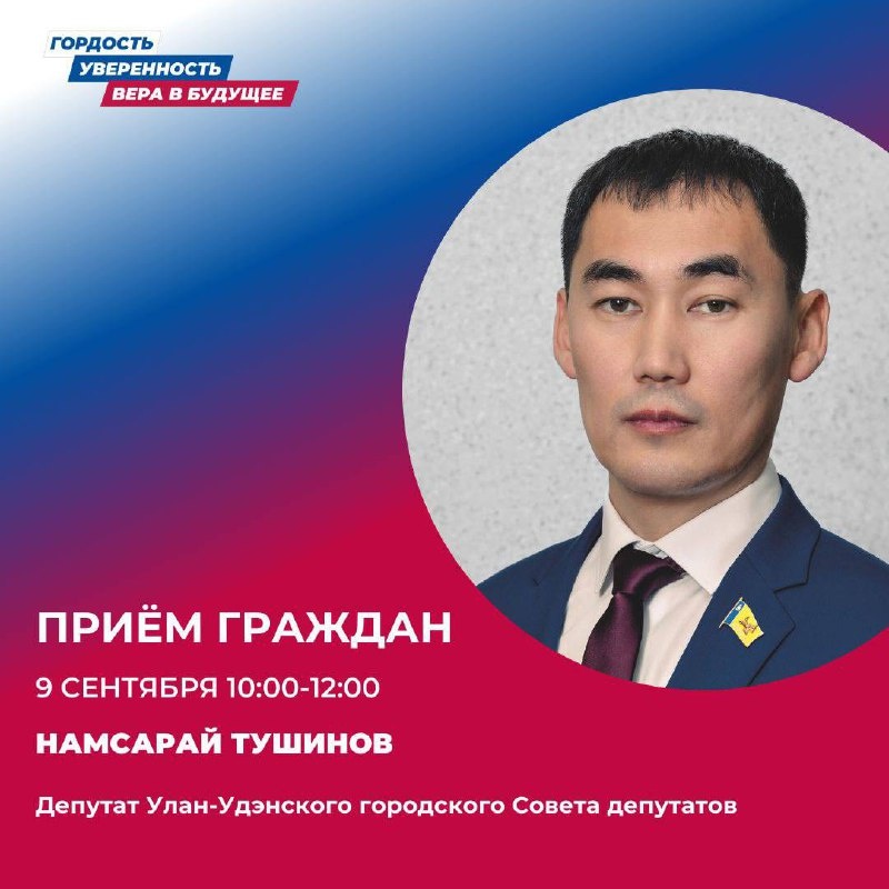 💬Депутат горсовета Улан-Удэ проведет прием граждан в Штабе общественной поддержки 📆Прием депутата Намсарая Тушинова пройдет 9 сентября с 10:00 до 12:00. 👩💻Для того, чтобы попасть на прием, необходима предварительная запись. Записаться можно по телефону: 89021-60-88-64. 📍Адрес Штаба общественной поддержки: г. Улан-Удэ, ул. Борсоева, 7а, 1 этаж.