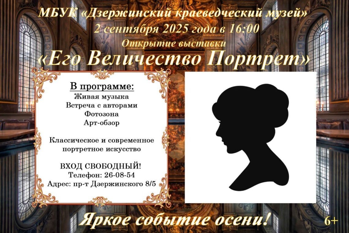 Дзержинский краеведческий музей приглашает на открытие выставки «Его Величество Портрет». Мероприятие состоится 2 сентября 2025 года. Начало в 16:00. На выставке «Его величество портрет» демонстрируются живописные и графические работы из художественного фонда музея, а также картины современных дзержинских авторов: И. В. Суворовой, Н. В. Еряшкина, Н. Н. Виноградова, Т. И. Петровой. Каждый портрет, представленный в экспозиции, имеет свою историю и может многое рассказать как об изображенном на нем человеке, так и о самом художнике. Портреты написаны в разных техниках, что придает им свой неповторимый вид и характер. Вход на открытие свободный.