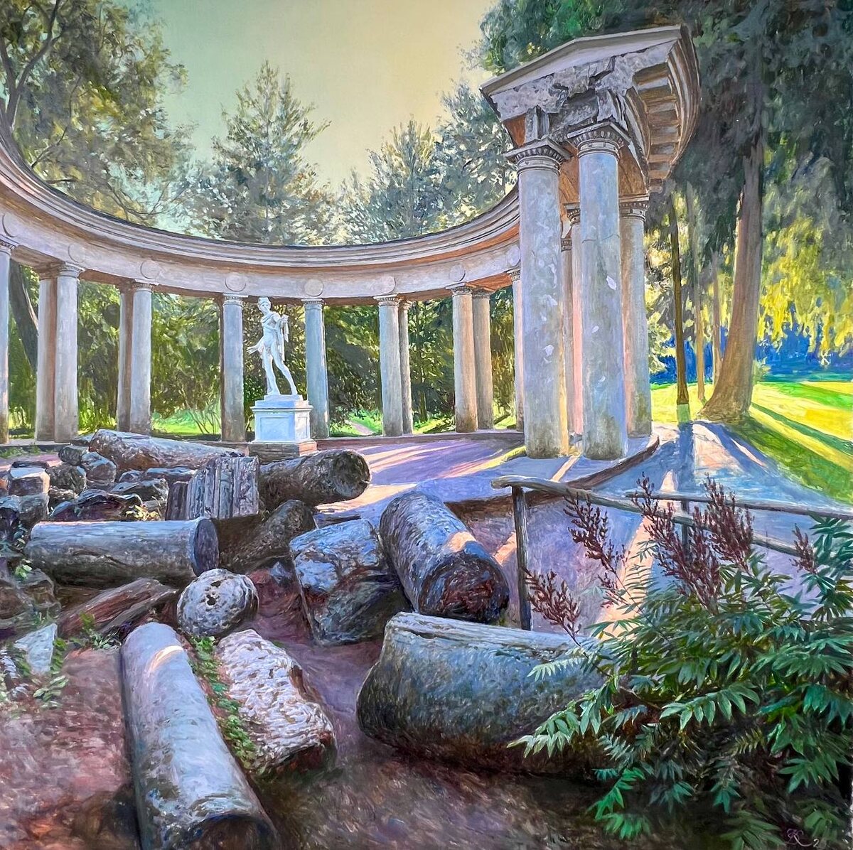 Павловский парк. Колоннада Аполлона 80х80 холст/масло 2025 ••• В картине «Памятник Аполлону в Павловске» шедевр Ч.Камерона — архитектурное обрамление копии классической статуи Аполлона Бельведерского — вновь находится на периферии внимания художника. Ракурс и композиция помещают на первый план руины, расположенные перед Аполлоном. В правой же части мы видим прекрасный пейзажный этюд в стиле И.Шишкина. Все вместе создает эффект какого-то сложного пересечения классицизма эпохи Винкельмана, импрессионизма, русского реалистического пейзажа и фотосъёмки. ••• Стать обладателем своего личного петербургского парка можно в галерее YOLKA art до 10 сентября. ••• Москва. Ходынский бульвар 20а, с 11:00 до 21:00 ежедневно. Выставка бесплатная, работы продаются. Вся контактная информация на сайте YOLKA.art