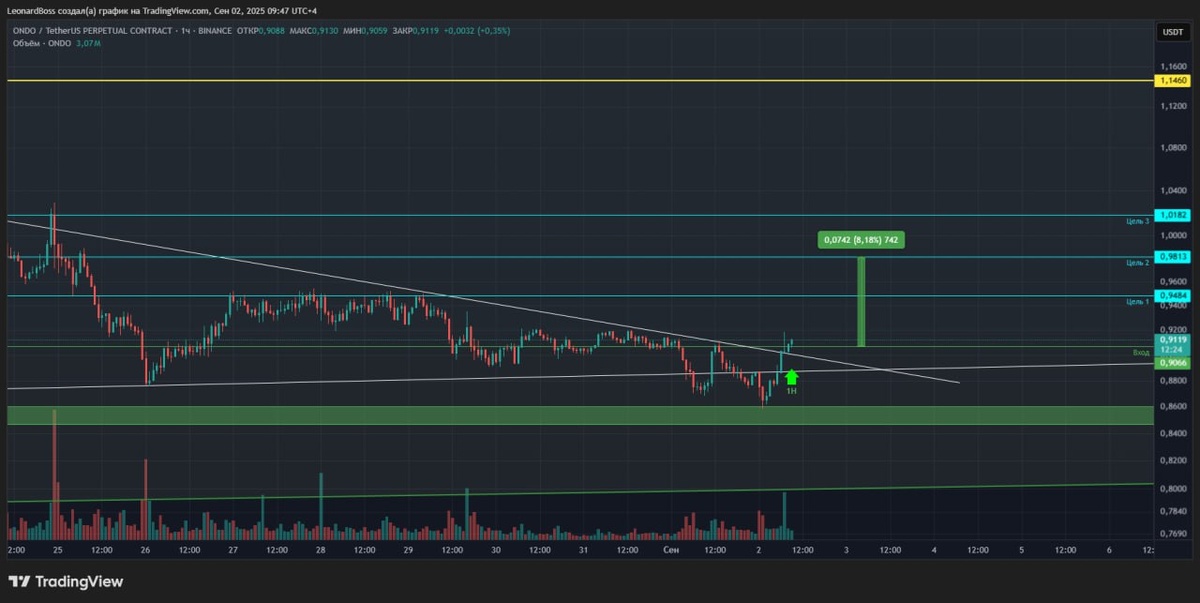 #ONDO 🔼🔼🔼 ⚠️Лонг, взял его с х3 плечом на пару тройку дней по близким целям. Инвест позиция набрана еще в июне в зоне уровня 0,7$, вам также маяковал. Кто рассматривает инвест активы, рекомендую не пропускать мимо. Даже, если и откатит с текущих, то не ниже 0,85$, вот прям ниже я его сейчас не вижу❌