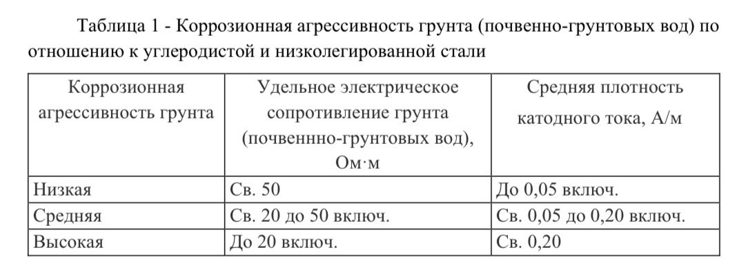 📙📗📒 Для оценки коррозионной агрессивности грунта по отношению к стали определяют удельное электрическое сопротивление грунта, измеренное в полевых или лабораторных условиях, и среднюю плотность катодного тока ⚠️ при смещении потенциала на 100 мВ отрицательней стационарного потенциала стали в грунте (см. таблицу 1). Если при определении первого показателя (удельного электрического сопротивления грунта) установлена высокая коррозионная агрессивность грунта, то другой показатель не определяют.