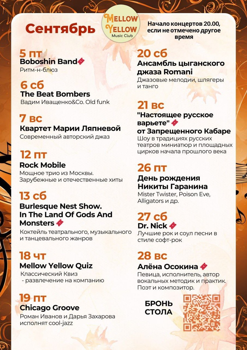 Друзья, встречайте нашу сентябрьскую программу. Здесь всё, как и должно быть. Три премьеры, танцы под рок-н-ролл, рокабилли и фанк, немного веселых каверов, бурлеск, кабаре, русская музыка и, конечно же, джаз.