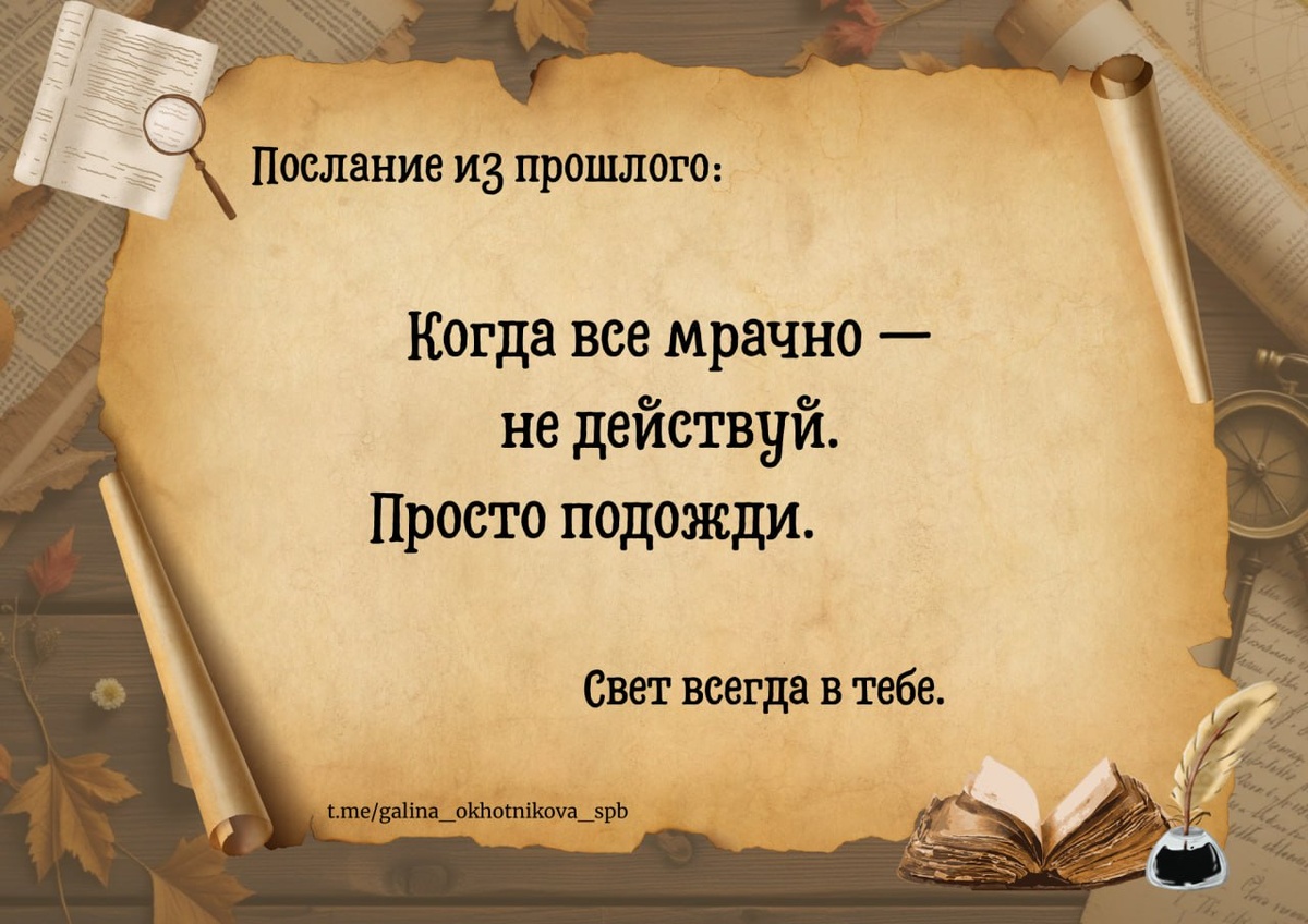 📜 Послание из прошлого Когда все мрачно — не действуй. Просто подожди. 🔸 Ты не обязана принимать решение прямо сейчас. 🔸 Ты имеешь право молчать. 🔸 Ты имеешь право ждать. И это тоже сила. Не верь себе, когда всё представляется тебе в мрачном свете, все кажутся виноватыми, всем хочется сказать и даже сделать что-то плохое. Смотри на себя в таком состоянии, как на пьяного, ничего не предпринимай и жди, когда это состояние пройдёт. Чем меньше будешь делать, находясь в этом состоянии, тем скорее оно пройдёт: для пьяного это воздержание так же необходимо, как сон. Лев Толстой📗Об истине, жизни и поведении 🕊 Свет всегда в тебе.