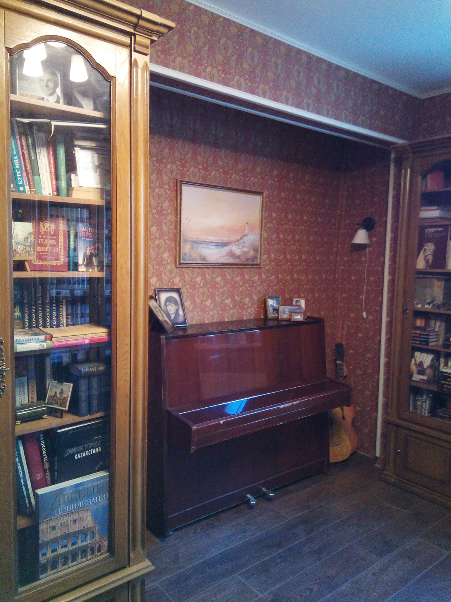 Увлечение у дочери подруги действительно прошло, и инструмент стал не нужен. Мы к тому времени переехали в большой дом, и я забрала инструмент обратно. Он совершенно шикарно встал в нишу в библиотеке, даже цветом изумительно совпал со стенами.
