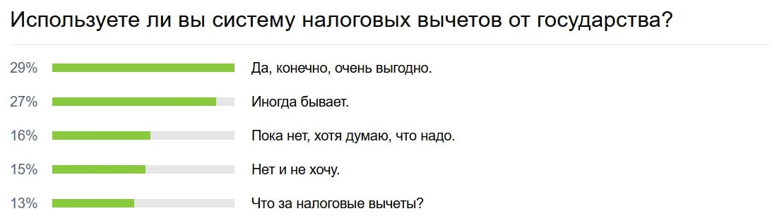 Мы решили поинтересоваться у хабаровчан, используют ли они систему налоговых вычетов от государства. 29% ответили утвердительно. Они считают, что это очень выгодно. 27% пользуются данной возможностью лишь иногда. 16% на данный момент еще не пробовали получить вычет, но считают, что им следовало бы попробовать. 15% ответили: «Нет и не хочу». Оставшиеся же 13% просто не знают, что такое налоговый вычет. Отметим, что на главной странице DVHAB.ru каждую неделю проводятся опросы на самые актуальные и острые темы. Найти вы их можете, пройдя по ссылке. Напомним, что ранее мы интересовались у хабаровчан, есть ли у них подработка, увеличивающая их доход, и устраивает ли их зарплата. 35% заявили, что текущий заработок их не устраивает, но работать больше они не хотят.