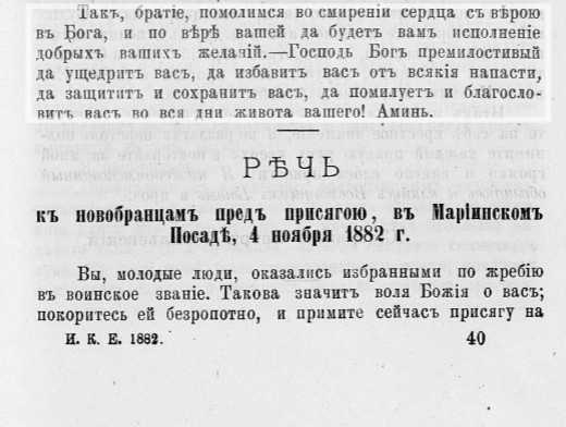 1882 год. Известия по Казанской епархии, 15 ноября № 22. Речь к новобранцам пред присягою в Мариинском Посаде 4 ноября 1882 года. Вы, молодые люди, оказались избранными по жребию в воинское звание. Такова значит воля Божия о вас; покоритесь ей безропотно, и примите сейчас присягу на верность службы нашему природному Всемилостивейшему Государю Императору и Его Наследнику. Присяга есть клятва именем Всемогущего Бога; клянусь, - будете говорить, Всемогущим Богом, - клятва эта будет запечатлена целованием святых слов Евангелия и животворящего Креста Господня. Присяга дается в доказательство того, что каждый из вас верно и нелицемерно будет служить Царю и Отечеству, и во всем повиноваться начальству, не щадя жизни своей до последней капли крови. Когда вы начнете говорить за мной слова присяги, то нужно будет вам сложит пальцы правой руки так, как складываете их обыкновенно, когда молитесь и крестное знамение на себе творите; с таким сложением перстов поднимете руку кверху, и продержите ее д