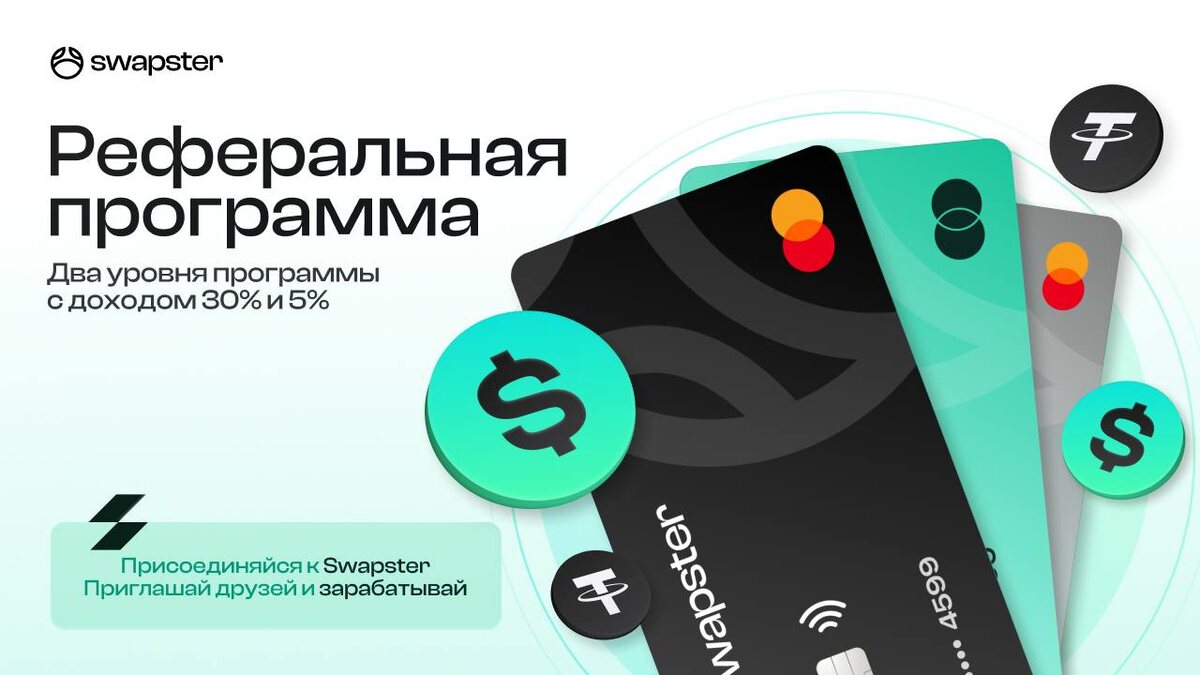 Два уровня вознаграждений: 30% и 5% от прибыли Swapster за обмены Как это работает: 1. Получите ссылку — в Telegram-боте во вкладке Информация → Партнёрская программа. 2. Рефералы регистрируются — они получают доступ к кошельку, обменам и виртуальным картам. 3. Вы зарабатываете — моментальные начисления при каждом обмене. Ваш доход: Для кого это выгодно: Бонусы за виртуальные карты: Создать кошелек | Создать виртуальную карту | Узнать больше о Swapster