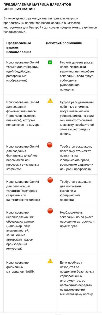 Netflix выпустил рекомендации, для кинематографистов, партнеров по производству и поставщиков, когда и как использовать искусственный интеллект Ожидается, что все партнеры по производству будут сообщать о любом предполагаемом использовании, поскольку продолжают появляться новые инструменты с различными возможностями и рисками. /TVBEurope/. Netflix обозначил 5 основных принципов, которые следует учитывать перед использованием генеративного ИИ в творческих рабочих процессах. Перед любым внедрением партнерам Netflix по производству следует отвечать на 5 вопросов: ▫️Результаты не воспроизводят и не воссоздают в существенной степени идентифицируемые характеристики не принадлежащих кому-либо или защищенных авторским правом материалов, а также не нарушают какие-либо работы, защищенные авторским правом. ▫️Используемые генеративные инструменты не хранят, не используют повторно и не обучаются на входных или выходных производственных данных. ▫️По возможности генеративные инструменты используются